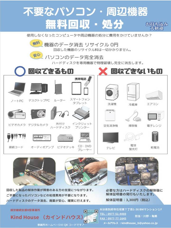 不要なパソコン・周辺機器 無料回収・処分いたします